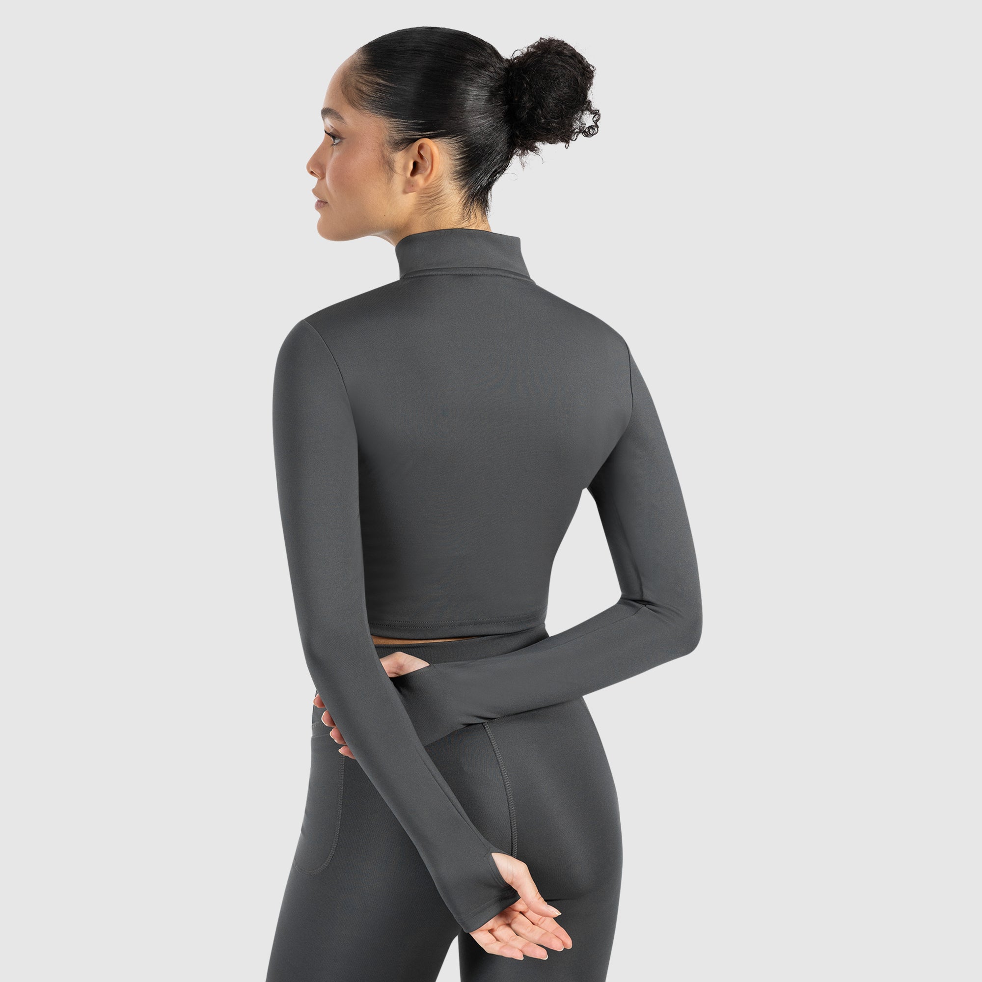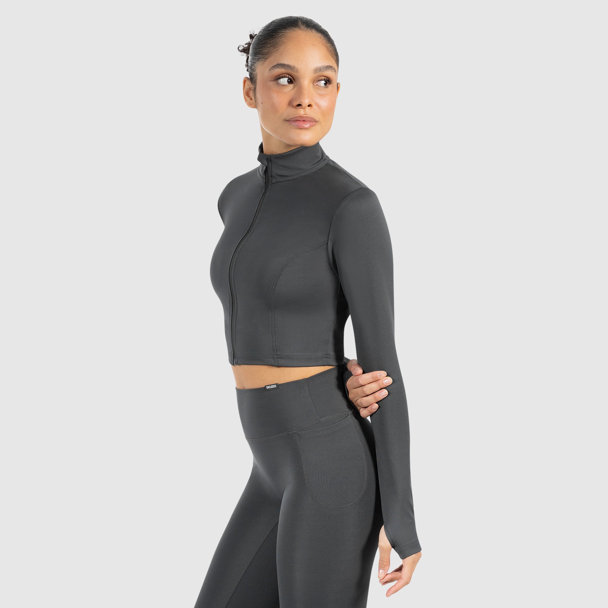 Unsere Crop Jacke für Damen kombiniert einen sportlichen Schnitt mit funktionalem Design. Der kurze, figurbetonte Fit betont deine Silhouette, während der Stehkragen und der durchgehende Reißverschluss für einen cleanen Look sorgen. Daumenlöcher an den Ärmeln geben zusätzlichen Halt. Ob beim Workout oder als Teil deines Freizeit-Outfits – diese Jacke sitzt wie angegossen.