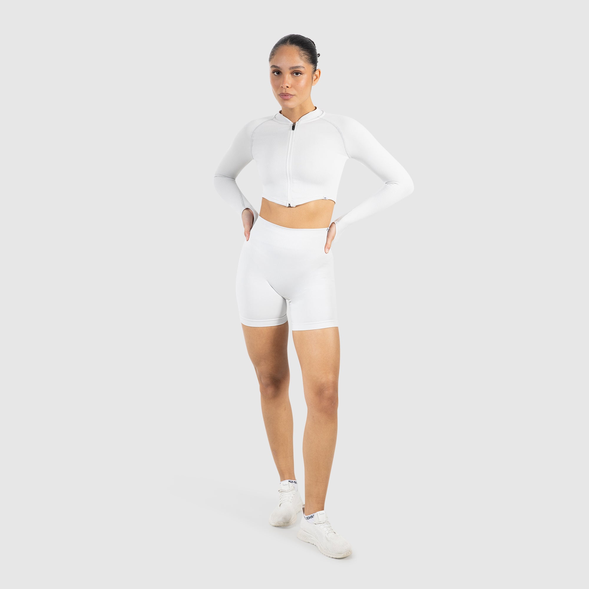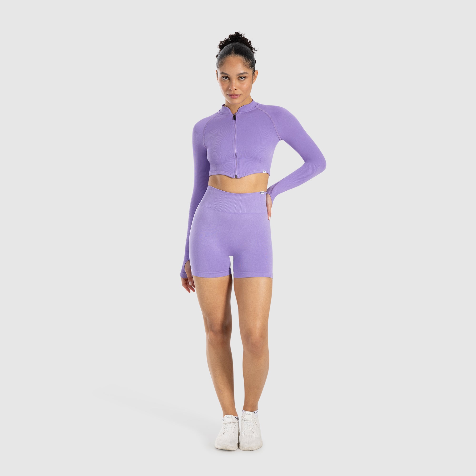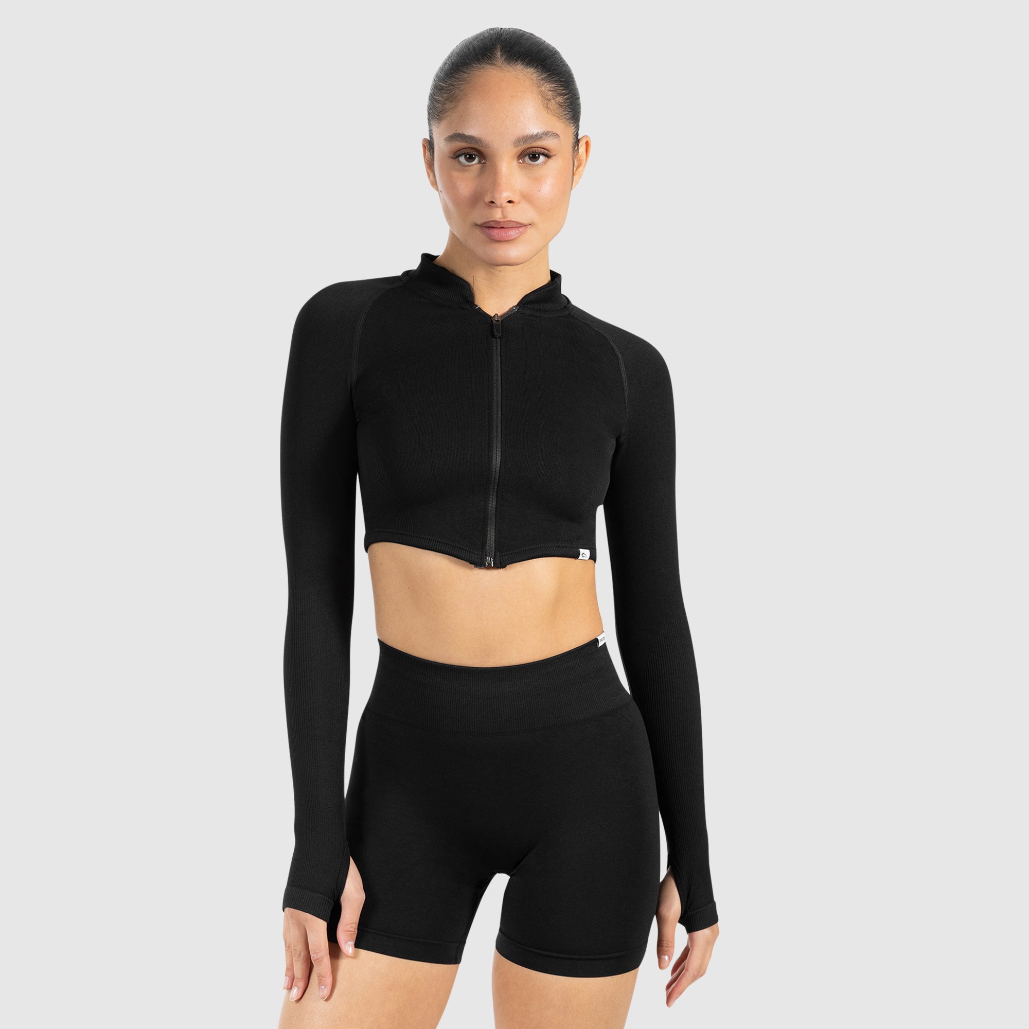 Unsere Crop Jacke überzeugt mit sportlichem Stil und funktionalem Komfort. Das nahtlose Material liegt angenehm auf der Haut und sorgt für volle Bewegungsfreiheit. Der Cropped Fit betont deine Taille, während der Stehkragen und der Reißverschluss für einen cleanen Look sorgen. Daumenlöcher an den Ärmeln geben sicheren Halt – perfekt für dein Warm-up, sportliche Outfits oder moderne Layering-Styles.